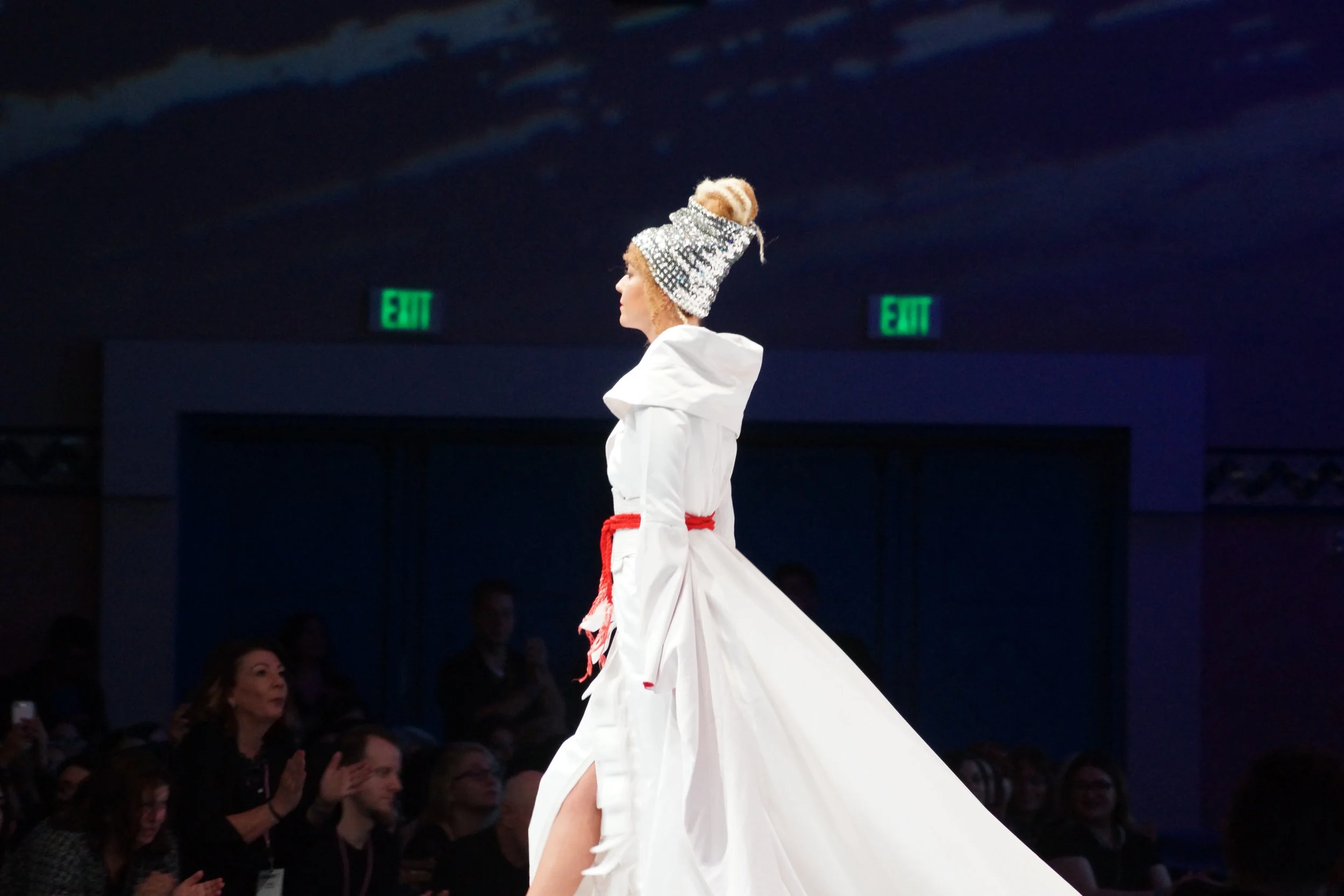 As a model, I spent the majority of my time between the wardrobe room, the makeup room, and the styling room, where Jeanne Braa Foster braided my hair into the most amazing style, but it wasn't all about the hair, in my case. I was asked to model for "Eyes on Cancer", wearing an incredible white kimono with a long train, and Jeanne styled me in one of her hat designs on stage. The designs are a series of hats and headscarves that have hair attached to them, for convenience, for cancer patients. Jeanne's idea is that beauty industry professionals should learn a thing or two about recognizing potential dangers in their clients that may be cancerous.
