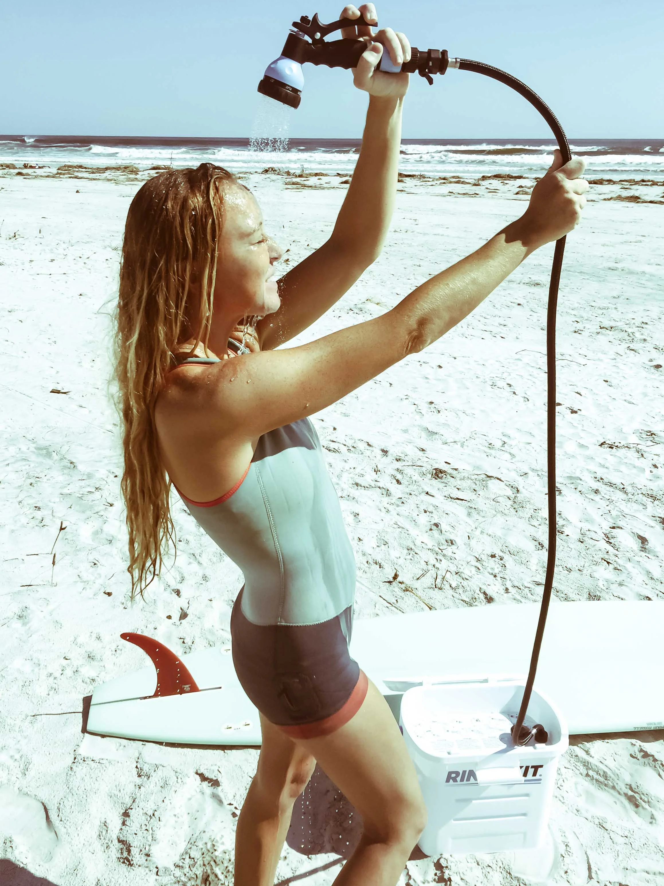 When you get out of the water, rinse all of that salt out of your hair right away. Don't let it bake into your hair in the sun. I've been using the Rinse Kit to help with that. I keep it right in the back of my car and I don't even have to take it out of the car to rinse off. It holds enough water to get me through several surf sessions so it's really a convenient little tool!